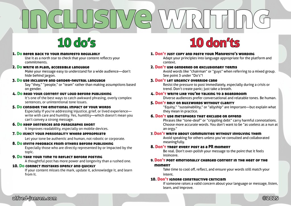 At the bottom of this page, you’ll find the “Do’s and Don’ts” of Inclusive Writing. You might find these guidelines useful. In addition, I’ve added some tips on how to (not) use AI in writing.