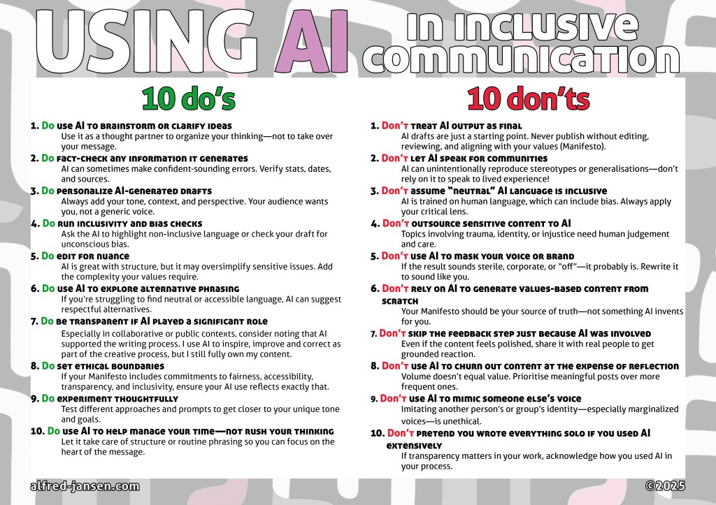 Inclusive Communication means translating your values into language that real people can connect with. It’s about tone, empathy, context, and relevance. That’s not always something AI does well. But it can be guided. And it can help if you stay in the driver’s seat.